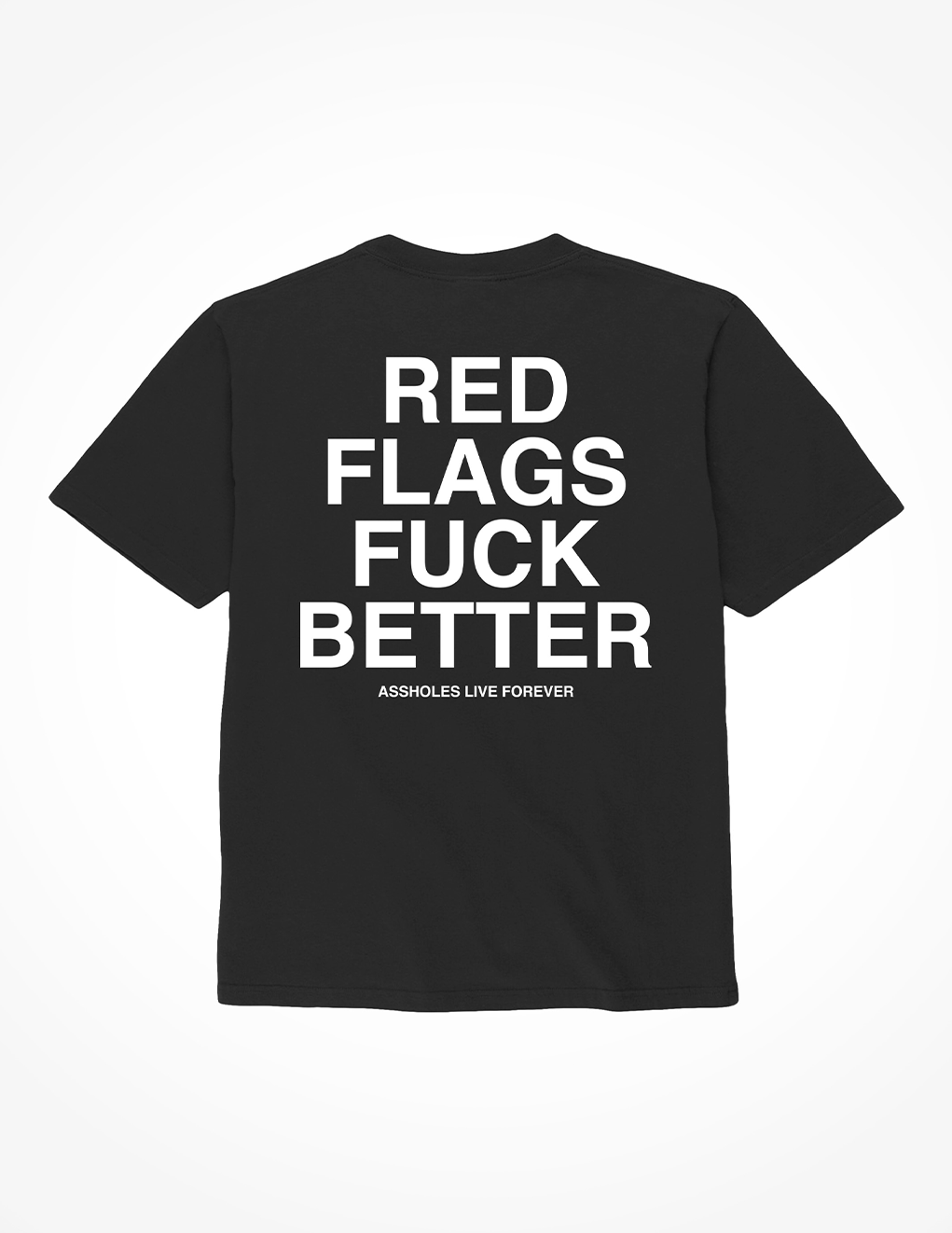 Let the world know your toxic type with the ALF “Red Flags F*ck Better” T-Shirt. Designed for bold personalities and unapologetic vibes, this tee features high-contrast white lettering on both front and back. Crafted from heavyweight cotton with a relaxed unisex fit, this graphic tee is a must-have from the Assholes Live Forever lineup. Wear it loud, wear it proud—and maybe send a warning while you're at it.