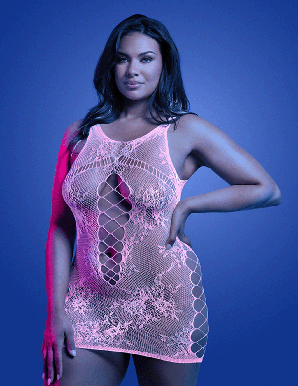 Turn up the allure and let your glow do the talking in the MAGNETISM Glow-in-the-Dark Lace Knit Dress. This captivating mini dress combines a delicate lace-inspired knit pattern with a bold, body-hugging silhouette that comes alive under UV light glowing a vibrant pink when the lights go down. Designed to flatter every curve, its soft stretch fabric ensures a smooth, comfortable fit that’s perfect for dancing, layering, or after-dark adventures.