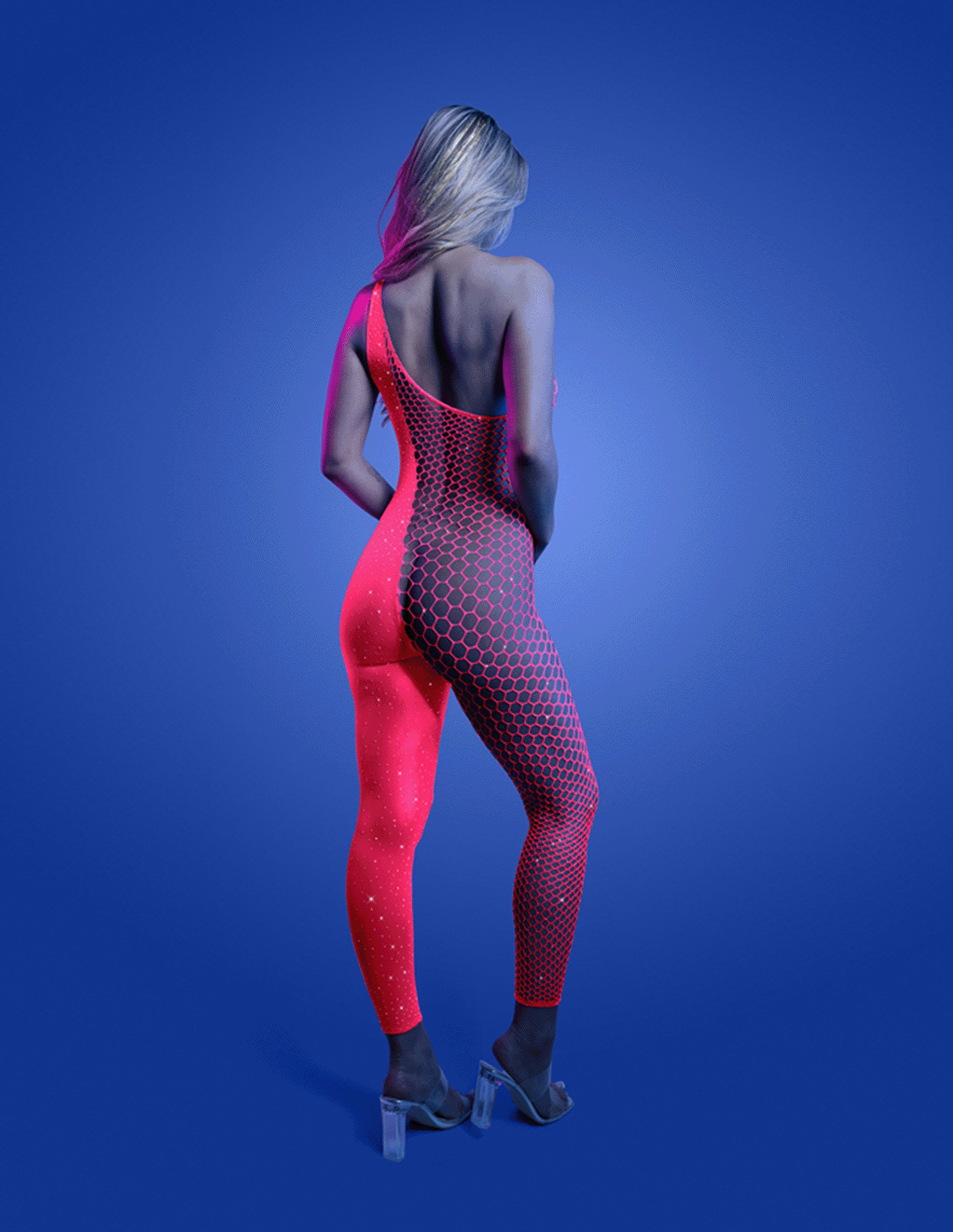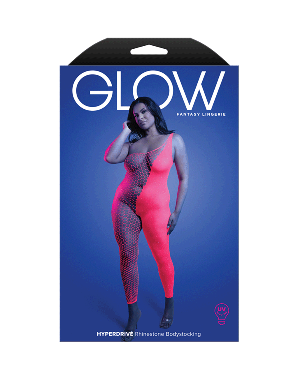 Take your glow to another galaxy in the HYPERDRIVE UV Reactive Rhinestone Bodystocking. This daring, asymmetrical design fuses futuristic flair with high-shine sparkle, featuring a one-shoulder silhouette and a mix of opaque and fishnet panels that sculpt and shimmer under UV light. Embellished with radiant rhinestones, this bodystocking was made to turn every head under blacklight perfect for festivals, club nights, or glowing up your lingerie drawer.