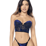 Turn heads in this Floral Burnout Velvet Cropped Bustier & G-String Set, a daring combination of elegance and seduction. The cropped bustier features a deep V-wire neckline and structured cups that enhance your curves beautifully. A sheer mesh back with crisscross lace-up detailing adds an irresistible finishing touch. The luxurious blue and black floral velvet adds depth and texture for a bold statement. Paired with a matching G-string, this set is perfect for unforgettable nights.