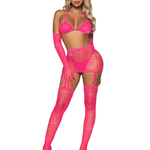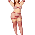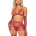 Spice things up in this Rhinestone Fishnet Garter Set. It comes with a bikini top, skirt, long length gloves, G-string, and stockings. This sexy set has hand laid rhinestones across the material. It sparkles as light hits it. The skirt accentuates the waist and hips. It has attached garters. The garter straps are adjustable. The silhouette of the fishnet makes your curves stand out. Pair this set with your best heels. Your lover won't be able to keep their eyes off of you.