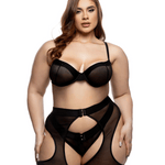 Redefine bold sophistication with this modern three-piece set. The Millennium Fishnet & Wide Elastic Set combines sheer mesh and structured elastic to create a powerful, sculpted silhouette. The balconette bra features underwire support and hook-and-eye details, while the high-waisted garter chaps and coordinating thong complete the look with sleek, confident style.