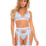 Janet 3 piece set by Oh La La Cheri is inspired by the python. Its python inspired lace snakes around the soft cups of the bra. It has keyhole designs around the nipple area. Thick adjustable straps accentuate the shoulders. The garter belt has python inspired lace that delicately wraps around the hips and thighs. Garter stays strap around each thigh, keeping the belt down. The g-string is covered in python inspired lace to match.