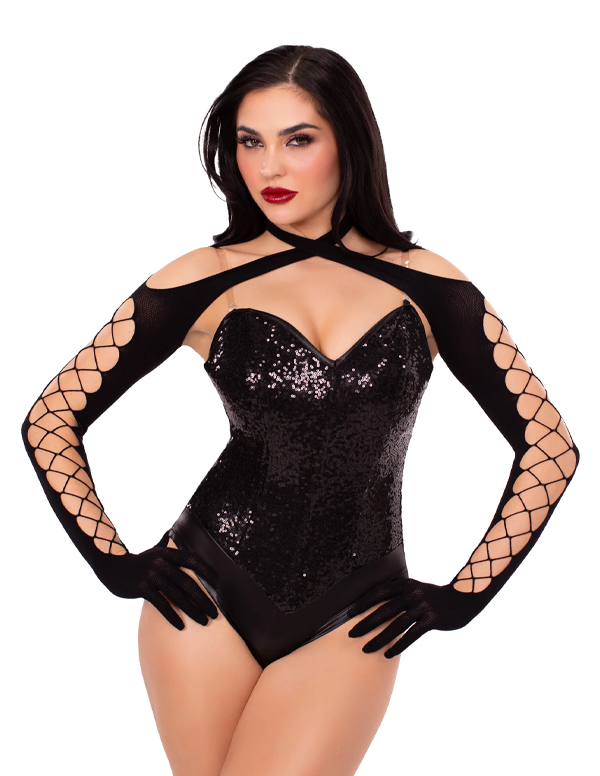 FEVER DREAM Collared plunge keyhole teddy w. detachable leg garters & hat