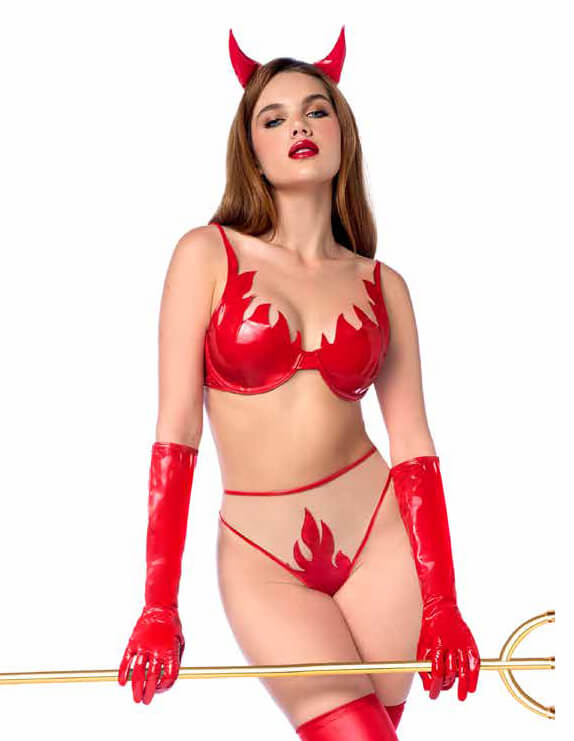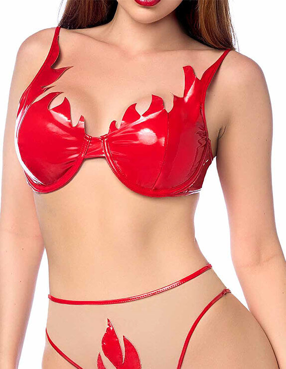 Bring the heat this Halloween in the Devil Vinyl Flame Underwire Bra & Panty. This sizzling red vinyl set features a flame-cut underwire bra for lifted, fiery cleavage and a matching high-waist mesh panty with bold flame detailing that leaves little to the imagination. Complete with glossy devil horns for the ultimate sinful finishing touch, this daring devil costume is all about owning your naughty side.
