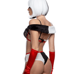 Serve pure villainous glamour in this striking two-piece lingerie set, complete with matching satin gloves. The demi-cup bra teases with contrasting black-and-white eyelash lace, framed in bold red satin and finished with plush velboa drop sleeves. The high-waist thong mirrors the daring contrast, offering a flattering fit and thong back that’s all about the reveal. Perfect for costume play, boudoir drama, or making every entrance unforgettable.
