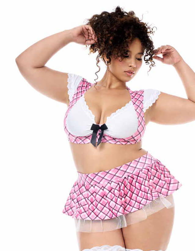Turn heads and play the perfect tease in this flirty School Girl Ruffle Plaid Crop Top & Skirt Set. Featuring a pink plaid halter-style crop top with lace trim and a black satin bow, plus a pleated ruffle mini skirt with tulle peeking underneath, this sexy schoolgirl costume is your go-to for Halloween parties, roleplay nights, or cheeky photo ops. This stretchy, curve-hugging fit brings major A+ energy.