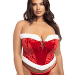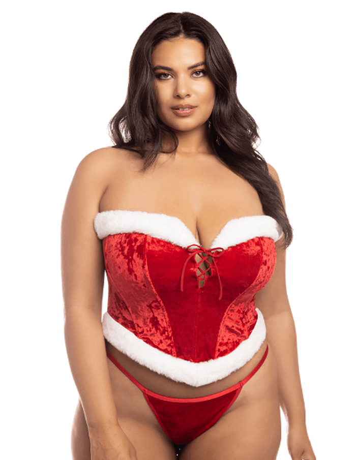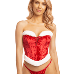 Embrace your bold side this season with our luxurious Naughty or Nice set. Crafted from sumptuous velvet and adorned with plush fur trim, this boned bustier delivers stunning silhouette and support.