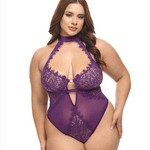 Turn up the tease with the Kennedy Eyelash Lace Collared Teddy. Designed to make a statement, this sultry one-piece pairs sheer lace with soft mesh panels and a high halter neckline that begs for a closer look. From the soft cups to the thong back, every detail is made to flirt from every angle. Slip it on and own the night.