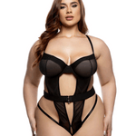 Command attention in the Millennium Fishnet & Wide Elastic Cut-Out Teddy. A daring mix of sheer mesh, bold cutouts, and high-contrast detail. Featuring a balconette-style underwire bra with decorative hook & eye accents, this teddy is made to frame your curves and flaunt your confidence. The wide elastic waistband cinches the waist, while the crotchless design and single-string thong back take the tease to the next level. Adjustable shoulder straps and hook & eye back closure ensure a flawless fit. It's fierce, flirty, and designed to make a statement, front to back.
