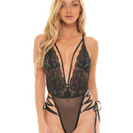 Get tangled up with The Sloane Teddy by Oh La La Cheri this Valentine's Day! This enticing teddy features a plunging neckline with strap accents, a high waist and adjustable satin side ties. The stretch lace accentuates your cleavage as the strappy lace neckline draws the eyes down to your snatched waist. The side ties that are fastened with gold o-rings guarantee that your hips will pop beautifully. The sheer mesh gives a sultry peek a boo feel. The back is a delicate criss cross with adjustable straps and a keyhole opening that highlights the small of your back.