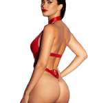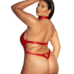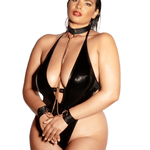 Leave them speechless at the sight of you in the Submissive Vinyl Teddy & Cuffs Set by Oh La La Cheri. This sexy 3 piece fantasy is complete with a wet look plunging teddy, soft handcuffs and collar with removable chain. A halter style neckline draws the eyes down to your cleavage framed in a deep v, supported by a golden o-ring adorned strap. The sleekly patterned outlines of this piece display your hips and thighs, cinching in your waist with with adjustable buckled accent straps. The booty baring backside features more o-rings that easily connect with the included lobster clasp chain, making the use of the handcuffs a breeze - or perfect to drape your body and tease your curves. A sultry addition to your dungeon wardrobe or a stunning surprise for your intended - they will fall to their knees when you slip into the Submissive!