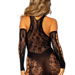 This sultry lace mini dress and glove set by Leg Avenue is the ultimate in daring lingerie. With intricate net panel cutouts, a deep-V strappy front, and a faux panty detail, it’s designed to captivate. The stretchy, see-through fabric ensures a flattering fit, complemented by matching gloves for added drama. Perfect for making a bold statement, this set is a must-have for your intimate wardrobe.